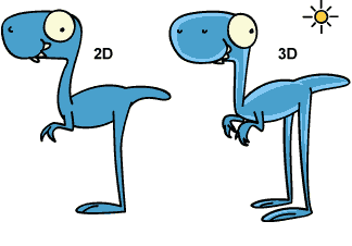 Please see illustrated examples I drew to demonstrate the perspective techniques I will teach in class. On the left is an example comparing a cartoon dinosaur drawn in 2D vs. 3D perspective. Below and left is a muscle car turned in perspective to create a sense of depth.
